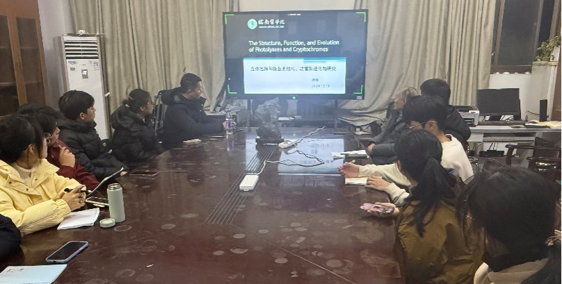 徐蕾教授以《光修复酶和隐色素结构、功能和进化的研究》为题,分享了其课题组在光修复酶和隐色素(CPF)蛋白家族领域的研究经历和成果。课题组通过广泛的系统发育分析,识别出一类新的CPD光修复酶分支——SPL蛋白亚家族,通过对该分支蛋白质结构域的分析,认为SPL亚家族可能是CPF蛋白家族的真正祖先。另外,徐教授介绍了另一种来自蓝藻的光修复酶SePhrB,能够高效修复DNA中的6-4光产物。徐教授强调,CPF蛋白家族与植物的生长发育和光形态建成、动物生物钟的调控以及肿瘤的发生发展密切相关,其结构和功能多样性以及系统发生值得深入研究。参加会议的师生与徐教授进行了相关问题的讨论,拓展了大家的视野,引出了相关领域合作开展研究的契机。