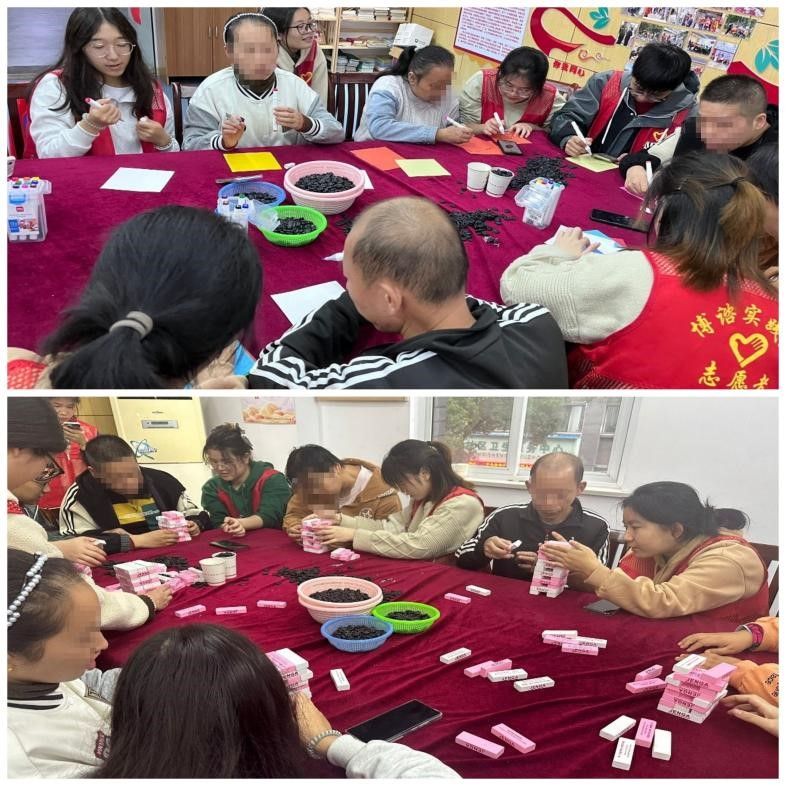 智游启思维,趣玩促成长。本次活动共设计了两个寓教于乐的游戏,给予了智残人士一个表达自我、展现才华的机会。在积木“抽抽乐”中,志愿者搭建积木塔,智残人士依次抽取积木,志愿者协助直至积木倒塌。在“秋叶作画”环节,智残人士自主选择彩纸,用彩笔描绘喜爱的图案,再由志愿者协助粘贴。