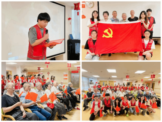 红色基因永传承,光辉历程映初心。为传承红色基因,赓续红色血脉,在建党节当天,博谘·幸福葆实践队全体党员在乐青荟颐养老院举办了“七一”主题党日活动。活动中,志愿者代表深情诵读了红色经典作品,接着,大家聆听老党员们的入党故事,深刻感悟党的初心与使命。最后,在老党员的带领下,全体党员重温了入党誓词,并合唱《没有共产党就没有新中国》和《歌唱祖国》等红歌。本次活动不仅是一场别开生面的党史学习,也是对共产党人精神谱系的继承与发扬,更为青年学子点亮了理想信念的灯塔。