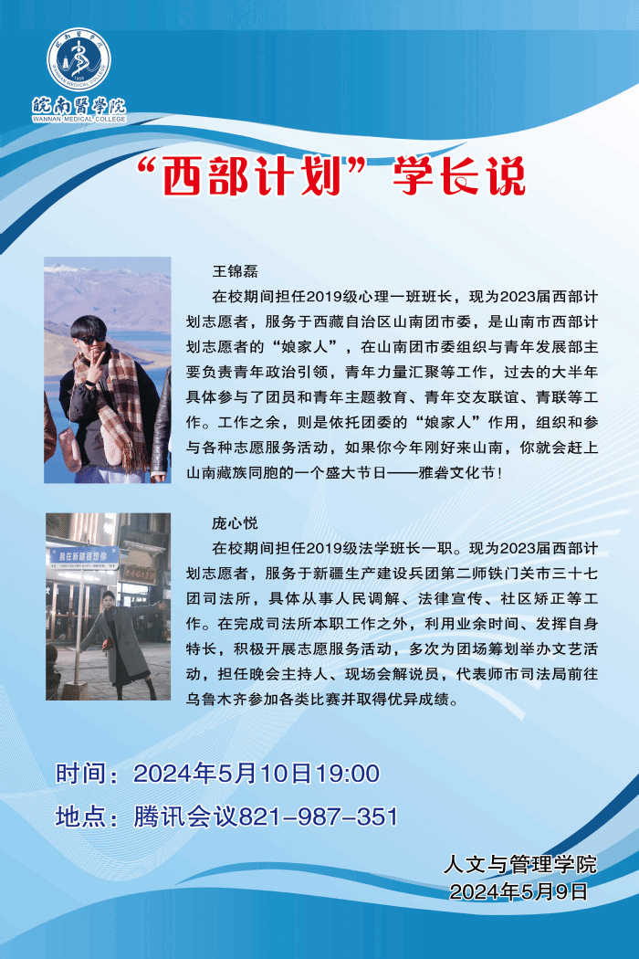 为帮助毕业班学生更加深入的了解西部计划,5月10日,太阳集团2018登录网址开展西部计划线上宣讲活动,会议邀请加入西部计划的2023届法学专业庞心悦、应用心理学专业王锦磊参加,学院党委副书记钱彬彬主持会议。