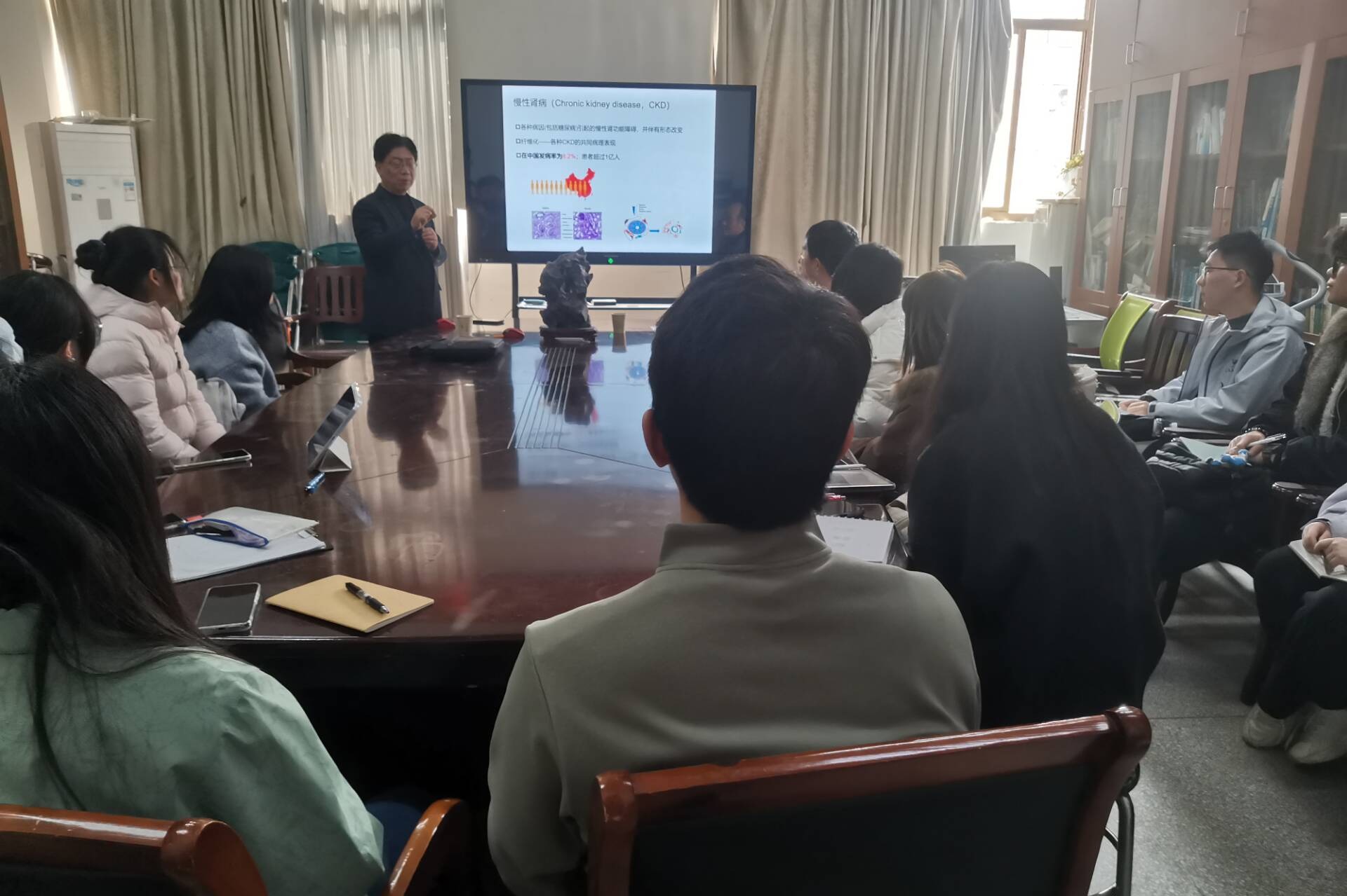 讲座中,陆利民教授以深厚的学术功底和独到的研究视角,围绕“尿毒症毒素的界定与分类”、“尿毒症毒素受体的作用机制”、“线粒体与细胞衰老的内在联系”,以及“尿毒症毒素受体是否通过泛素化连接酶活性调控线粒体PGC1α蛋白水平”等核心议题,展开了一场系统而全面的阐述。他巧妙地将现实问题与科学方法相结合,为听众勾勒出了一条从现象观察到理论构建,再到实验验证的完整科研路径。整场报告内容丰富、逻辑严密,语言既深入浅出、通俗易懂,又不乏风趣幽默、引人入胜,让与会者在轻松愉悦的氛围中领略到了科学研究的魅力,更激发了大家对未知领域的探索欲望。