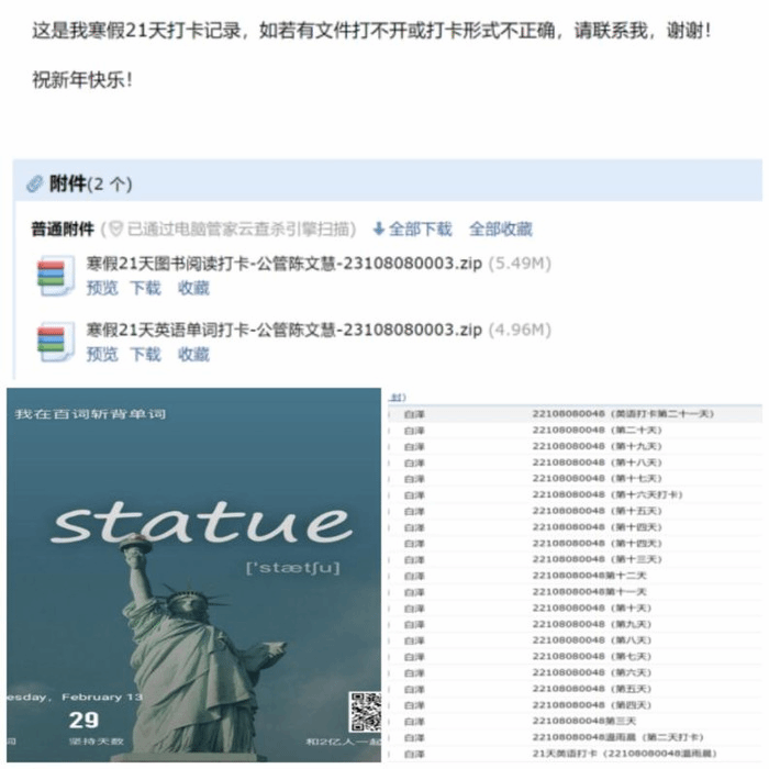 励学笃行,知行合一。业精于勤,荒于嬉。为帮助同学们在假期期间培养自律精神,养成良好的学习生活习惯,开展了“寒假21天打卡计划”活动。此次打卡活动分为图书阅读、英语单词打卡两个模块,同学们通过读书笔记、APP打卡等途径进行每日打卡。学习打卡活动不仅让学习有了仪式感,也为同学们带来了成就感。