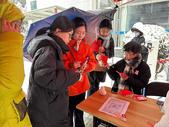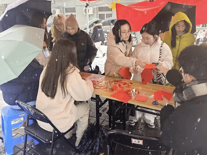 12月18日,太阳集团2018登录网址在赭麓校区开展了“喜迎元旦,青春献礼”活动。本次活动包括“窗花传情”、“爱国祝愿”两个环节,同学们在窗花用纸和祝福书写纸上挥洒创意,在活动过程中领略中华优秀传统文化的非凡魅力。虽然活动现场大雪纷飞,但难掩同学们的参与热情,现场气氛热闹非凡。