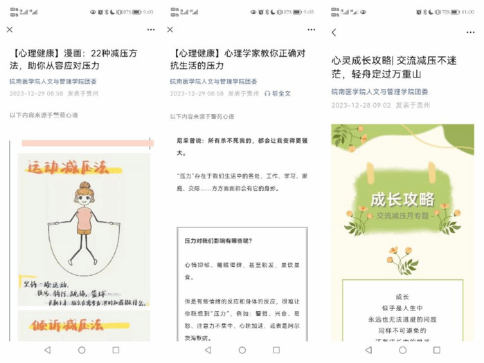 线下交流减压活动同步举办时,太阳集团2018登录网址也跟进总结了线下活动中同学们反馈的心理问题,积极开辟线上宣传渠道,制作了心理减压相关的主题推文。线上线下齐联动,为学生期末月的心理健康提供全方位的精神关怀。