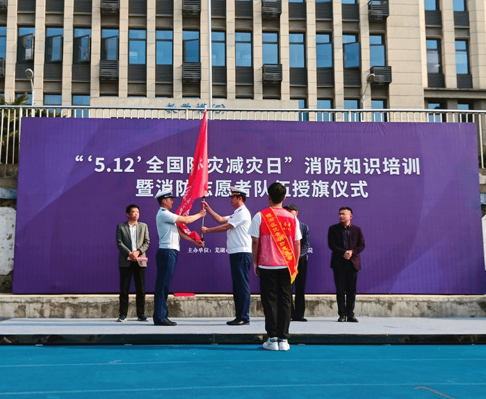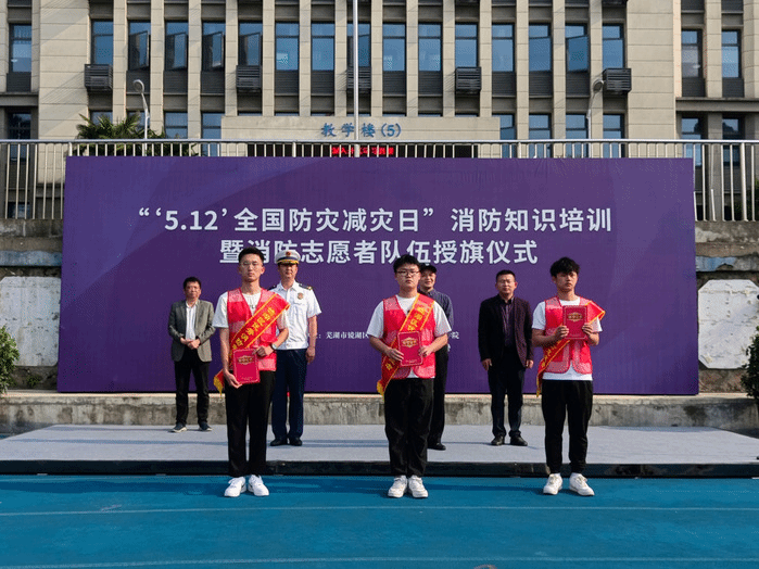5月12日,芜湖市镜湖区消防救援大队在我校开展“5.12全国防灾减灾日”消防知识培训暨消防志愿者队伍授旗仪式。太阳集团2018登录网址“博谘”实践队全体志愿者,党委书记王军和党委副书记钱彬彬出席活动。