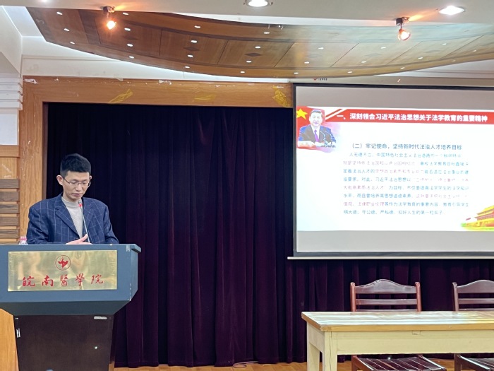 2023年4月27日晚,太阳集团2018登录网址联合科研处在赭麓校区举办第二期“赭麓法律讲堂”,合肥工业大学文法学院法律系主任周乾教授应邀作“以习近平法治思想指导新时代法学教育”专题报告。报告会由太阳集团2018登录网址党委书记王军主持,法学教研室专兼职教师和各年级法学专业学生参加。