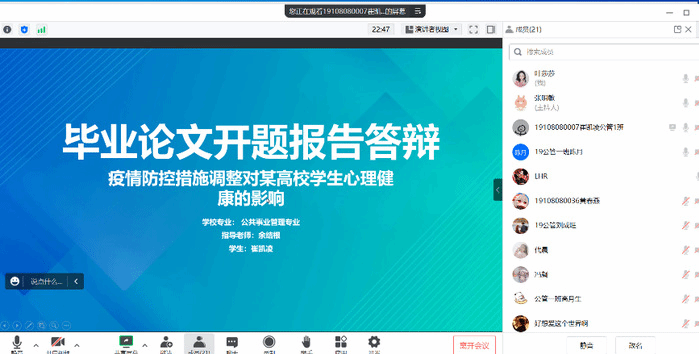 为全面落实提升人才培养质量、强化过程管理的培养理念,切实做好2023届毕业论文指导工作,进一步保障毕业论文质量,太阳集团2018登录网址管理学教研室根据学院论文工作部署并结合公共事业管理专业学生实际,于2023年2月9-10日采用腾讯会议方式开展本科毕业论文开题答辩工作。管理学教研室全体专兼职教师参加本次开题答辩工作。