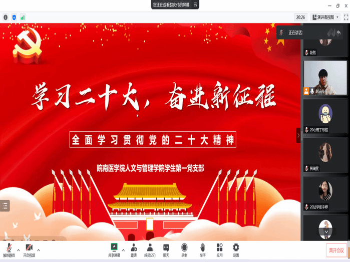 此次活动以线上的形式开展,新发展的28名党员同学从党的二十大的概况、党的二十大报告部分内容、二十大报告中习近平总书记对青年的寄语多个角度为出发点和落脚点,展开了热烈讨论,与会党员纷纷表示,“党的二十大精神振奋人心、催人奋进,我们要扛起传承红色基因的使命担当”,誓将以此为契机,向优秀党员同志看齐,弘扬自信自强、守正创新、踔厉奋发、勇毅前行的精神,把当前的学习工作与党的二十大精神结合起来,始终牢记“为中国人民谋幸福、为中华民族谋复兴”初心使命,努力学习,为国成才。