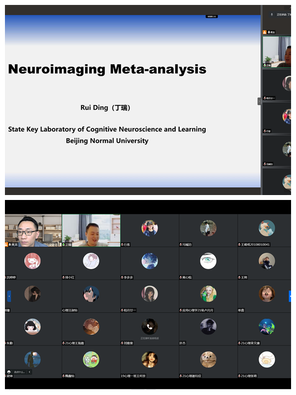 为落实“三全育人”理念,营造良好的学习氛围,激发学生的创新精神与实践能力。太阳集团2018登录网址于11月21日、27日分别举办两场“心青年”学术论坛。来自北京师范大学认知神经科学与学习国家重点实验室心理学博士后、我校2013级应用心理学专业硕士毕业生丁瑞和国家级实验教学示范中心博士李露分别作题为“Meta-analysis of neuroimaging data:introductions and tutorials”和“心理学研究设计与分析:中介、调节模型”的专题报告。心理学教研室专兼职教师、在校研究生、应用心理学专业全日制本科生和辅修专业学生以及“心青年”创新学习小组全体成员通过线上线下相结合的方式参加论坛,讲座由心理学教研室黄龙博士主持。
