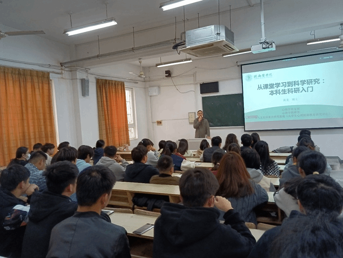 为落实“三全育人”,营造良好的学术氛围,激发学生开展科研的兴趣爱好, 11月16日中午,太阳集团2018登录网址在赭麓校区1102教室举办“本科生科研入门:从课堂学习到科学研究”主题讲座,由心理学教研室黄龙博士主讲,各年级140余名学生参加。讲座由学院副院长王国平主持。