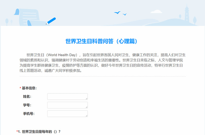 4月15日至4月17日,学院开展“疫起防护卫生,携手应对新冠”世界卫生日线上答题活动,普及健康卫生知识,增强疫情防护意识,呼吁同学们携手佑护生命健康,共同构建生命健康共同体。