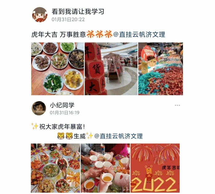 人间烟火处,年味最浓时。1月29日至2月8日,学院开展“定格美好瞬间,分享冬日碎片”线上活动,用视频、图片等方式记录、分享自己在新春佳节捕捉到的“美好日常碎片”。快门闪动拍下的“温馨小日子”里,年夜饭色香味俱全、大红灯笼高高挂起、烟火绚烂绽放,通过倡导、传播富有民族特色的、积极向上的文化生活理念,不断增强学子的求知欲、创造力、自豪情与幸福感。