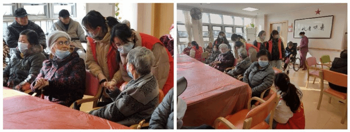 志愿者们围着老人们坐在院内的座椅上,亲切交谈,询问老人近期生活状况,以实际行动陪老人聊天话家常,有说有笑,为老人送去温暖和关怀。