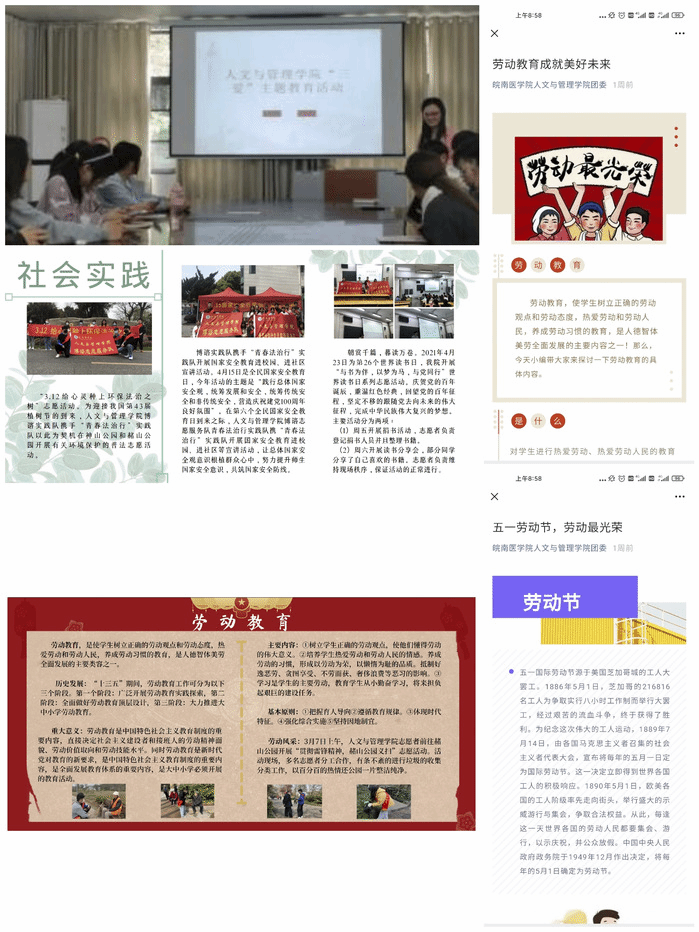 开展一次集中宣传活动。4月28日,太阳集团2018登录网址团委展开“三爱”学习主题教育活动,由学院团委副书记张露讲授,2020级全体团干参加。张露以闻一多的主要事迹为开篇,其爱读书、爱国情感影响了在场的每一位学生。青春正当时,逐梦新征程,张露鼓励同学们积极学习优秀文化思想,全面提高自身素质,脚踏实地、勇担重任,努力成为新时代的先行者。4月28日,太阳集团2018登录网址学生会宣传部制作并张贴了“劳动教育”和“实践活动”两块展板,图文并茂地展现了太阳集团2018登录网址近期劳动教育的成果。4月29日至5月1日,太阳集团2018登录网址学生会微信公众号发布两篇推文《劳动教育成就美好未来》、《五一劳动节,劳动最光荣》,全面做好劳动教育宣传工作,营造良好舆论氛围。