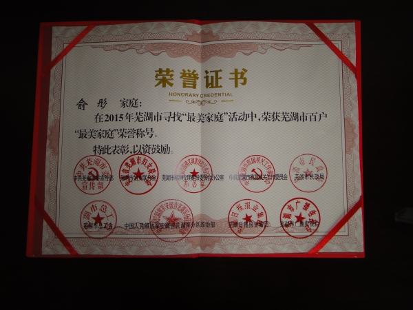 市妇联为了弘扬先进,树立典型,发挥示范引领作用,持续开展“寻找最美家庭 弘扬时代家风”主题活动,积极培育“夫妻和睦、尊老爱幼、勤俭持家、科学教子、邻里互助”的家庭美德,市委宣传部、市文明办、市妇联、市直机关工委、市民政局、市总工会、芜湖军分区、芜湖报业集团、市广电等九家单位召开表彰大会授予我校俞彤家庭为芜湖市百户“最美家庭”荣誉称号。