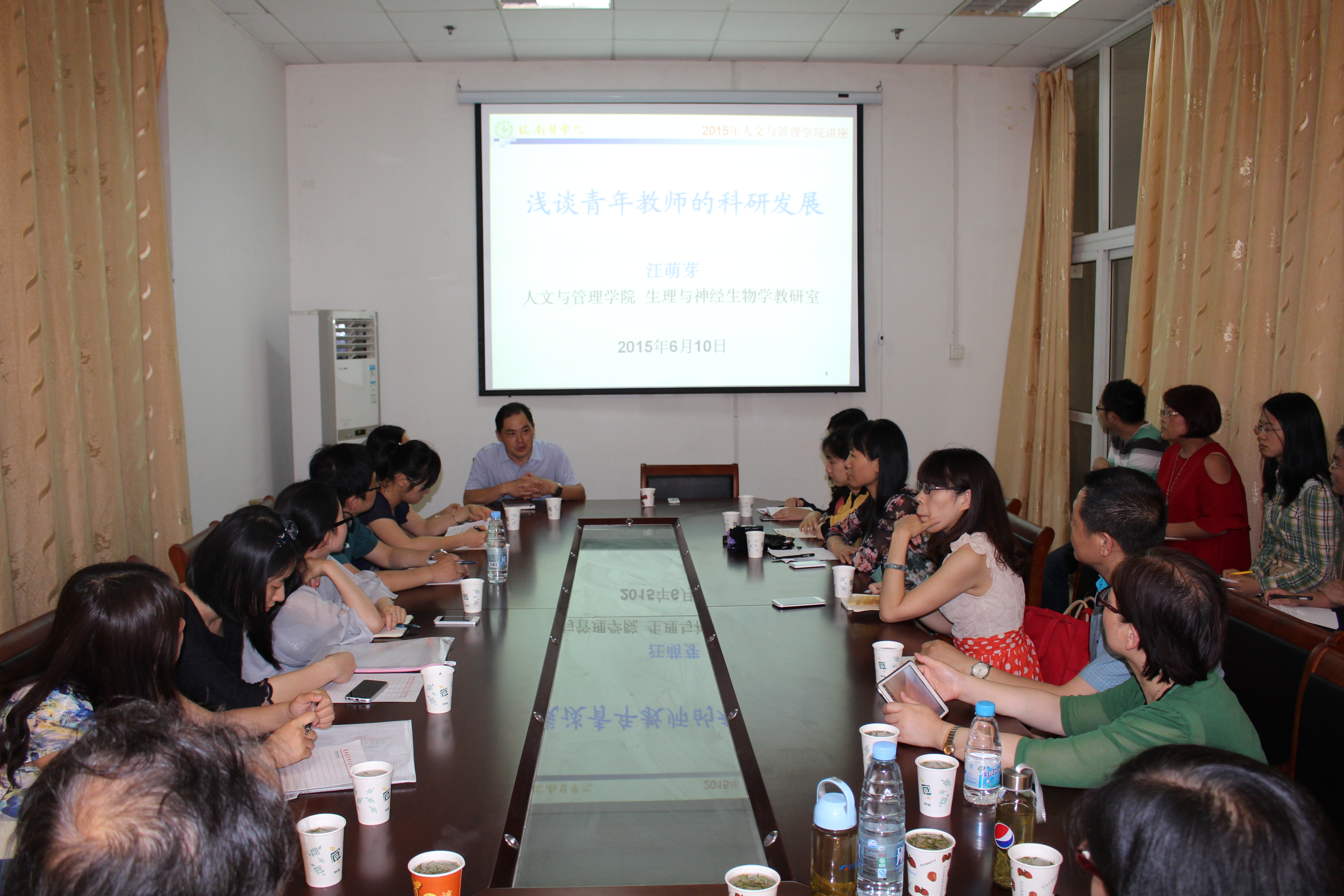 汪教授以医学模式转变为切入点,结合自己三十多年的科研工作经历和生理学与神经生物学科的发展历程,围绕着科研理念、思维、设计等方面,深入浅出地阐述了青年教师如何结合自身的学科特点凝练自己的科学研究方向。汪教授指出科学研究不可能一蹴而就,需要长期积累,只有经过长期的科学研究实践,才能由量变到质变,最终实现自己的人生梦想;科学研究需要合作,只有合作,才能共羸,青年教师要快速融入团队、融入学科,紧贴专业、学科建设的客观需要,结合自身的特长,寻找结合点,通过学科交叉、综合创建研究特色,并在专业、学科发展的平台上成就个人的人生理想。汪教授的讲座以全新的视角、精辟的见解,给与会教师留下了深刻的启发。