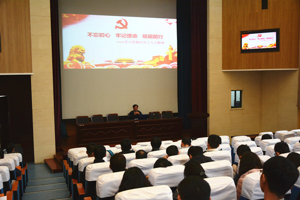 胡鸿从“不忘初心”四个字开始,详细介绍了党的十九大召开的背景、党的十九大会议的主要内容,重点解读了习近平新时代中国特色社会主义思想内涵和基本方略。他要求全体学生要掀起学习党的十九大的热潮,要学会用习近平新时代中国特色社会主义思想武装头脑、指导实践。报告最后,胡鸿结合自身学习党的十九大报告的经验,畅谈了学习感受,深入地介绍了“新思想引领新时代,新征程承载新使命”的具体内涵。