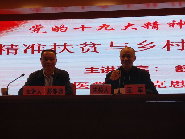 舒寒冰老师主要从习近平总书记在党的十九大上的发言与党的十九大精神的内涵、“要金山银山,更要绿水青山”与建设美丽乡村的战略等方面进行了详尽的阐述。报告紧扣“精准扶贫与乡村振兴战略”的同时,旁征博引,尽展文人风姿,将一幅“开轩面场圃,把酒话桑麻”的美景映入眼帘;黄土为墙石为路,山岚缭绕伴晨雾,舒老师话语中静谧安详的乡村寄托了他“无处安放的乡愁”,使得在场师生共同在诗画中深刻领会党的十九大精神的意义所在。