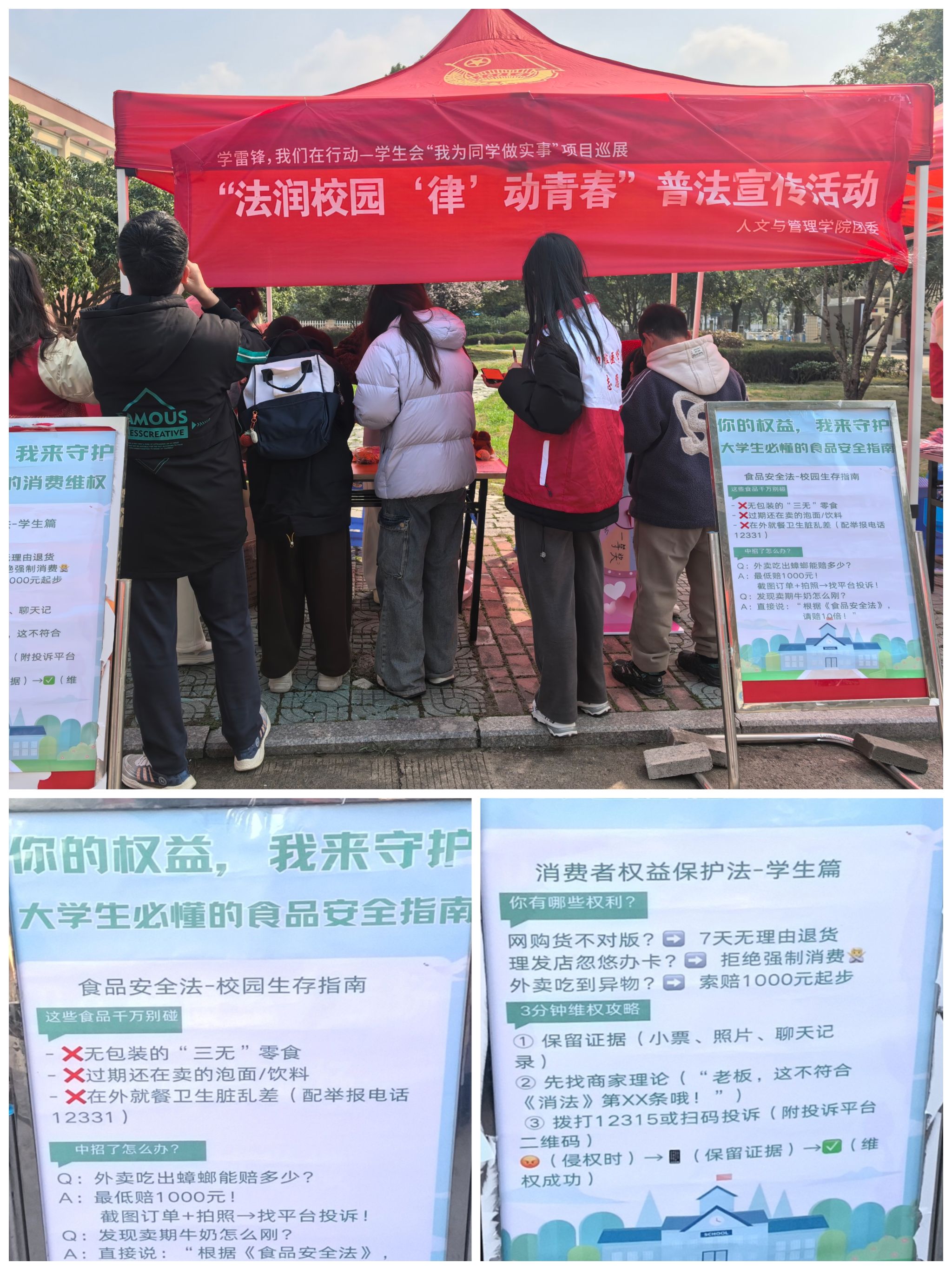 法润青春正当时,律护权益启新章。为增强学生法治观念、筑牢权益保护意识,3月16日,太阳集团2018登录网址在滨江校区南区举办“我为同学做实事”主题普法活动。活动以生动形式普及消费者权益保护法、食品安全法,旨在引导学生在生活中知法、懂法、用法。