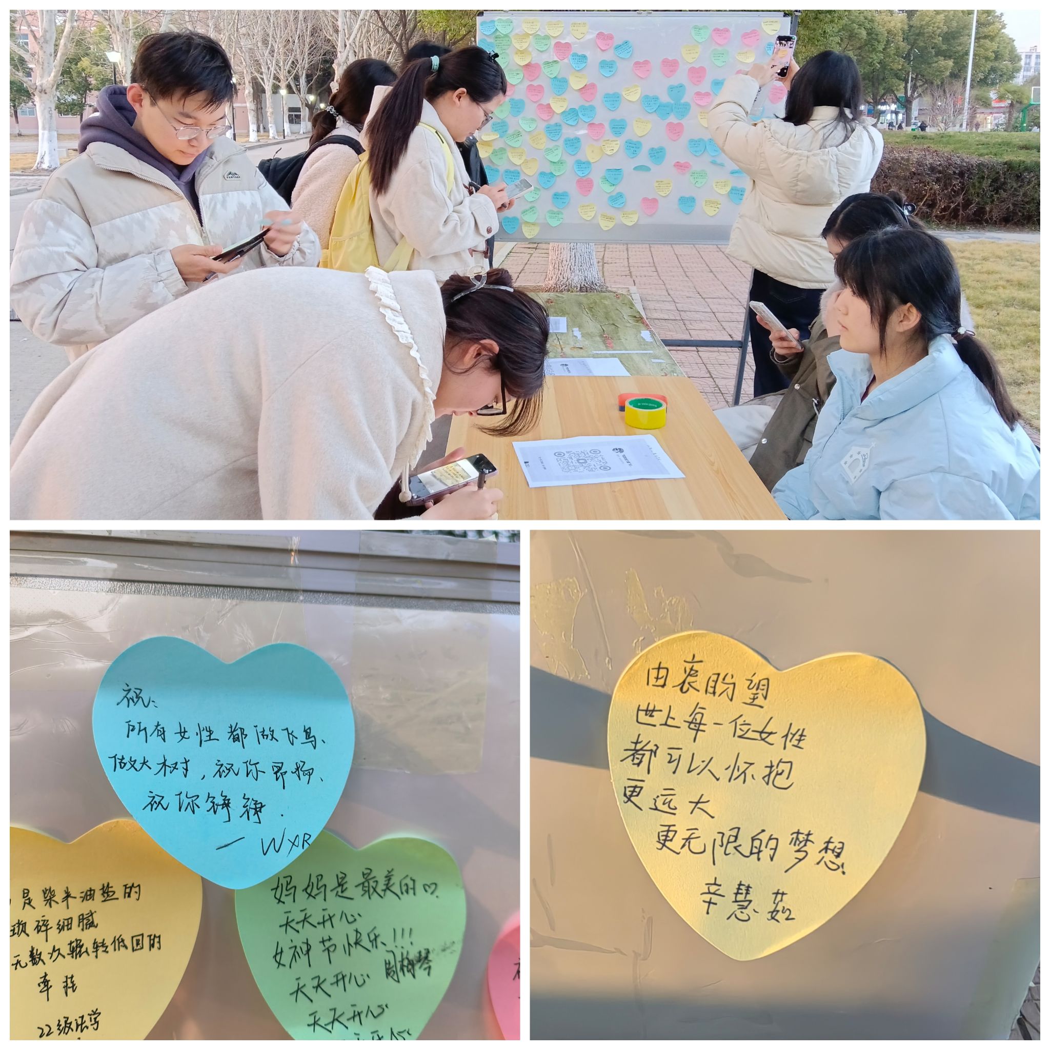 笔端书敬意,笺纸寄温情。“由衷地祝愿世上每一位女性都可以怀抱更远大、更无限的梦想!”在“绽放她力量”祝福语打卡活动现场,众多学生纷纷驻足,写下对女性的赞美与祝愿。一笔一划,都饱含着对女性的尊重与关爱,小小的卡片承载着融融暖意。活动结束时,整面白板已化作流动的星河,字句在春风里呢喃着:祝你昂扬,祝你铮铮。