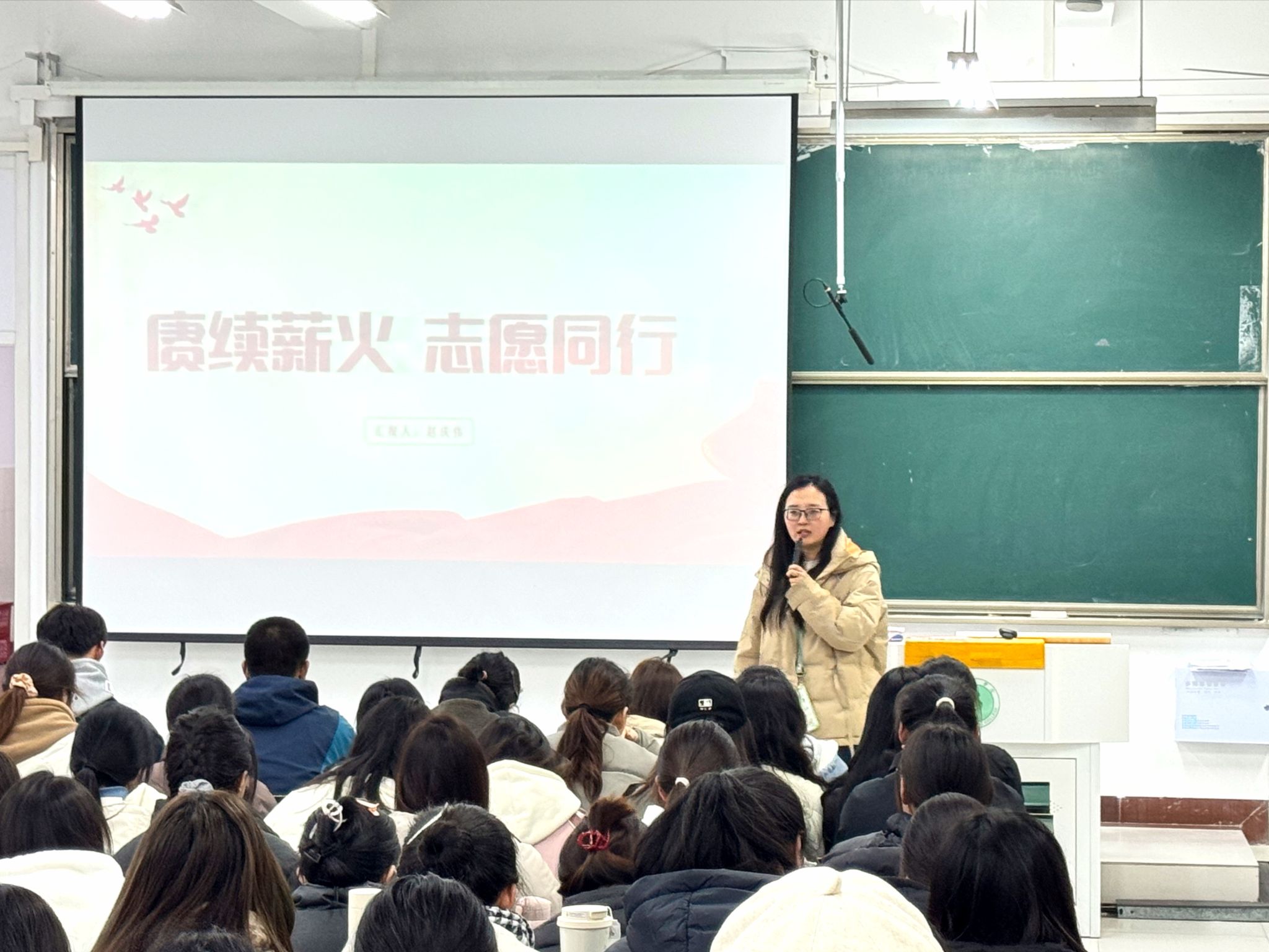 致敬奉献初心,分享成长足迹。赵庆伟以《赓续薪火,志愿同行》为主题,以自身经历为脉络,回顾大学期间参与的各项志愿服务活动,重点交流了自己参加西部计划的初心。在新疆参加西部计划期间,赵庆伟以“追梦人”的信念、“实干家”的姿态深耕基层一线,在实践中践行青春的誓言,其优秀事迹被团中央微博宣传。赵庆伟还介绍了自身在新疆参加西部计划的所见所闻、所思所想,鼓励同学们以专业所长回应国家之需,在祖国和人民最需要的地方绽放青春。