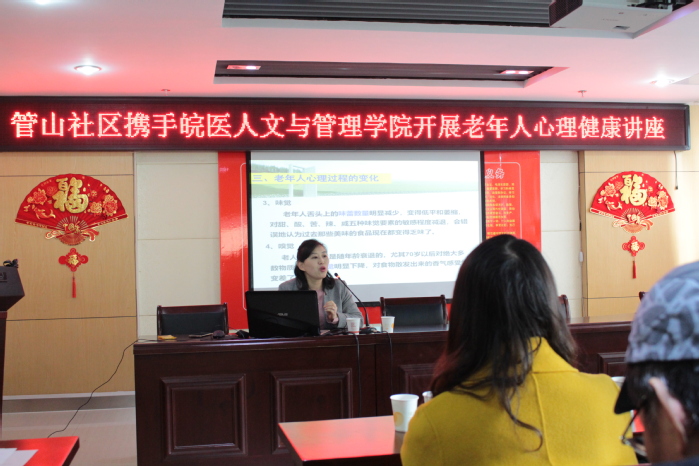 太阳集团2018登录网址教师党员、心理学副教授、国家认证心理评估师、中国残疾人协会心理康复专业学会委员张婷为社区老年朋友们开展“新风尚·心健康”心理健康知识讲座。讲座中,张婷通过老人们填写的问卷了解他们的心理健康情况,从生理因素、环境因素、生活因素和文化因素等方面入手,结合常见的老年人多疑善感、记忆力下降等现象,分析了老年人出现心理问题的原因,并建议老年人应该多参加运动,保持乐观积极的心态。张婷的讲课生动活泼、寓教于乐,受到老年人的一致好评。