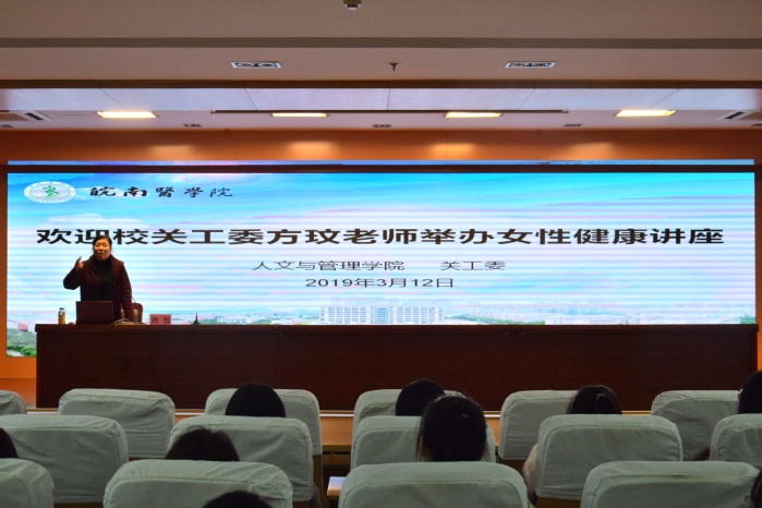 为更好的关爱女性健康,提高女大学生对个人健康安全的认识,3月12日晚六点三十分,太阳集团2018登录网址联合校关工委在图书馆三楼报告厅举办了女性健康讲座,校关工委老师方玟担任主讲人,太阳集团2018登录网址辅导员訾梦婷,2017、2018级全体女生现场聆听讲座。